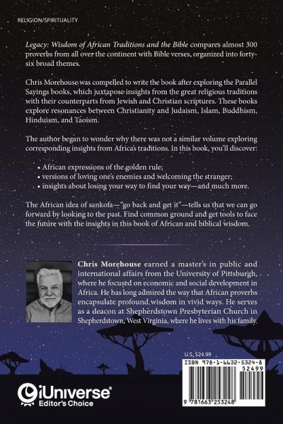 Legacy: Wisdom of African Traditions and the Bible compares almost 300 proverbs from all over the continent with Bible verses, organized into forty-six broad themes. Chris Morehouse was compelled to write the book after exploring the Parallel Sayings books, which juxtapose insights from the great religious traditions with their counterparts from Jewish and Christian scriptures. These books explore resonances between Christianity and Judaism, Islam, Buddhism, Hinduism, and Taoism. The author began to wonder why there was not a similar volume exploring corresponding insights from Africa's traditions. In this book, you'll discover: ¿ African expressions of the golden rule; ¿ versions of loving one's enemies and welcoming the stranger; ¿ insights about losing your way to find your way-and much more. The African idea of sankofa-"go back and get it"-tells us that we can go forward by looking to the past. Find common ground and get tools to face the future with the insights in this book of African and biblical wisdom.