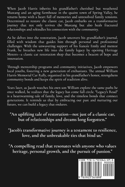 When Jacob Harris inherits his grandfather's cherished but weathered Mustang and an aging farmhouse in the quaint town of Spring Valley, he returns home with a heart full of memories and unresolved family tensions. Determined to restore the classic car, Jacob embarks on a transformative journey that not only revives the Mustang but also heals fractured relationships and rekindles his connection with the community. As he delves into the restoration, Jacob uncovers his grandfather's journal, filled with wisdom that guides him through personal and professional challenges. With the unwavering support of his fiancée Emily and mentor Frank, he breathes new life into the family legacy by opening Heritage Motors-a classic car restoration shop that becomes a beacon of hope and innovation. Through mentorship programs and community initiatives, Jacob empowers local youths, fostering a new generation of enthusiasts. The annual William Harris Memorial Car Rally, organized in his grandfather's honor, strengthens community bonds and keeps the spirit of tradition alive. Years later, as Jacob watches his own son William explore the same paths he once walked, he realizes that the legacy has come full circle. "Legacy's Road" is a heartwarming tale of family, love, and the timeless bonds that connect generations. It reminds us that by embracing our past and nurturing our future, we can build a legacy that endures.