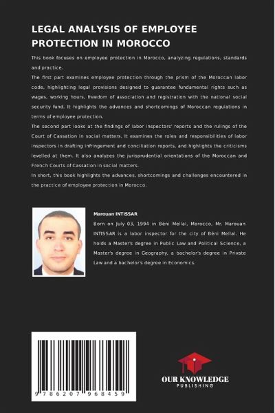 This book focuses on employee protection in Morocco, analyzing regulations, standards and practice.The first part examines employee protection through the prism of the Moroccan labor code, highlighting legal provisions designed to guarantee fundamental rights such as wages, working hours, freedom of association and registration with the national social security fund. It highlights the advances and shortcomings of Moroccan regulations in terms of employee protection.The second part looks at the findings of labor inspectors' reports and the rulings of the Court of Cassation in social matters. It examines the roles and responsibilities of labor inspectors in drafting infringement and conciliation reports, and highlights the criticisms levelled at them. It also analyzes the jurisprudential orientations of the Moroccan and French Courts of Cassation in social matters.In short, this book highlights the advances, shortcomings and challenges encountered in the practice of employee protection in Morocco.