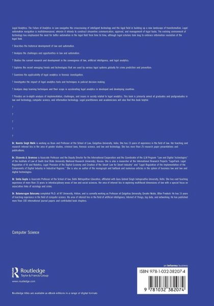 This book navigates the crisscrossing of intelligent technology and legal field in building up new landscape of transformation. It analyses deep learning techniques and its scope in accelerating legal analytics in countries & provides in-depth analysis of implementation, challenges and issues in the society related to legal analytics.