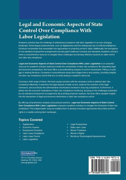 Academic scholars face the challenge of addressing compliance with labor legislation in an ever-changing landscape. Technological advancements, such as digitalization and the widespread use of artificial intelligence, introduce complexities that necessitate new approaches to protecting workers' rights. Additionally, the emergence of non-standard employment arrangements has disrupted traditional concepts and standards. Legal and Economic Aspects of State Control Over Compliance With Labor Legislation serves as the essential solution for academic scholars seeking to navigate these challenges. By integrating legal and economic perspectives, this groundbreaking monograph fills a crucial gap in existing literature by providing a comprehensive study that bridges theory and practice in the field of labor law compliance control. Covering a wide range of topics, this book equips scholars with the necessary tools to effectively address labor law compliance. It delves into the legal aspects of state control, examines the evolution of the legal framework, and scrutinizes the administrative mechanisms involved in ensuring compliance. Additionally, the book explores the economic implications of labor law compliance monitoring, with a particular focus on the challenges presented by non-standard employment arrangements. Through empirical research and analysis, Legal and Economic Aspects of State Control Over Compliance With Labor Legislation offers valuable insights into the intersection of legal and economic dimensions, enabling scholars to develop innovative approaches that protect workers' rights in the dynamic and evolving landscape of labor relations.