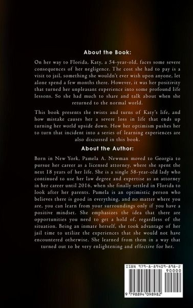 On her way to Florida, Katy, a 54-year-old, faces some severe consequences of her negligence. The cost she had to pay is a visit to jail, something she wouldn't ever wish upon anyone, let alone spend a few months there. However, it was her positivity that turned her unpleasant experience into some profound life lessons. So she had much to share and talk about when she returned to the normal world. This book presents the twists and turns of Katy's life, and how mistake causes her a severe loss in life that ends up turning her world upside down. How her optimism pushes her to turn that incident into a series of learning experiences are also discussed in this book.