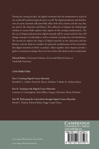 During the coming decades, the digital revolution that has transformed so much of our world will transform legal education as well. The digital production and distribution of course materials will powerfully affect both the content and the way materials are used in the classroom and library. This collection of essays by leading legal scholars in various fields explores three aspects of this coming transformation. The first set of essays discusses the way digital materials will be created and how they will change concepts of authorship as well as methods of production and distribution. The second set explores the impact of digital materials on law school classrooms and law libraries and the third set considers the potential transformation of the curriculum that the materials are likely to produce. Taken together, these essays provide a guide to momentous changes that every legal teacher and scholar needs to understand.