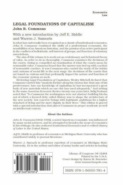 Reviewing Legal Foundations of Capitalism, Wesley Mitchell declared that Commons carried this "analysis further along his chosen line than any of his predecessors. Into our knowledge of capitalism he has incorporated a great body of new materials which no one else has used adequately." And writing in the same American Economic Review twenty-one years later, Selig Perlman noted that "To Commons the workingmen were not abstract building blocks out of which a favored deity called History was to shape the architecture of the new society, but concrete beings with legitimate ambitions for a higher standard of living and for more dignity in their lives." This edition is graced with a special introduction that places Commons in proper academic as well as intellectual context.