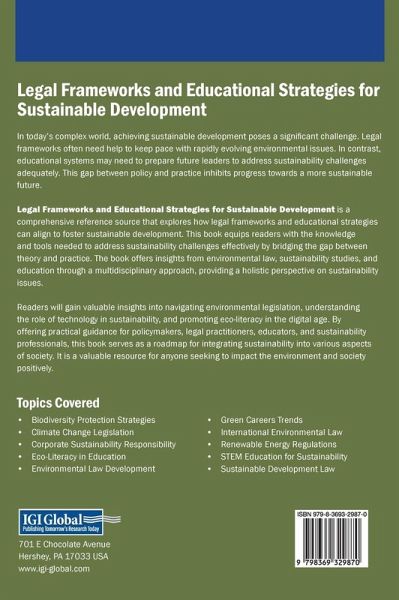 In today's complex world, achieving sustainable development poses a significant challenge. Legal frameworks often need help to keep pace with rapidly evolving environmental issues. In contrast, educational systems may need to prepare future leaders to address sustainability challenges adequately. This gap between policy and practice inhibits progress towards a more sustainable future. Legal Frameworks and Educational Strategies for Sustainable Development is a comprehensive reference source that explores how legal frameworks and educational strategies can align to foster sustainable development. This book equips readers with the knowledge and tools needed to address sustainability challenges effectively by bridging the gap between theory and practice. The book offers insights from environmental law, sustainability studies, and education through a multidisciplinary approach, providing a holistic perspective on sustainability issues.