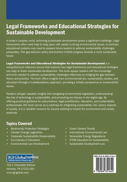 In today's complex world, achieving sustainable development poses a significant challenge. Legal frameworks often need help to keep pace with rapidly evolving environmental issues. In contrast, educational systems may need to prepare future leaders to address sustainability challenges adequately. This gap between policy and practice inhibits progress towards a more sustainable future. Legal Frameworks and Educational Strategies for Sustainable Development is a comprehensive reference source that explores how legal frameworks and educational strategies can align to foster sustainable development. This book equips readers with the knowledge and tools needed to address sustainability challenges effectively by bridging the gap between theory and practice. The book offers insights from environmental law, sustainability studies, and education through a multidisciplinary approach, providing a holistic perspective on sustainability issues.