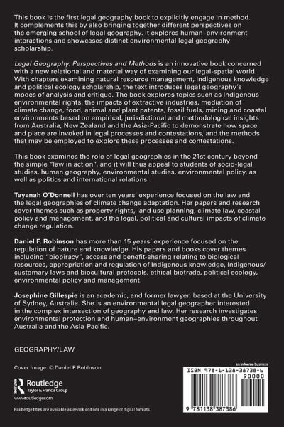 Legal Geography: Perspectives and Methods is an innovative book concerned with a new relational and material way of examining our legal-spatial world. With chapters examining natural resource management, Indigenous knowledge and political ecology scholarship, the text introduces legal geography's modes of analysis and critique. The book explores topics such as Indigenous environmental rights, the impacts of extractive industries, mediation of climate change, food, animal and plant patents, fossil fuels, mining and coastal environments based on empirical, jurisdictional and methodological insights from Australia, New Zealand and the Asia-Pacific to demonstrate how space and place are invoked in legal processes and contestations, and the methods that may be employed to explore these processes and contestations.
