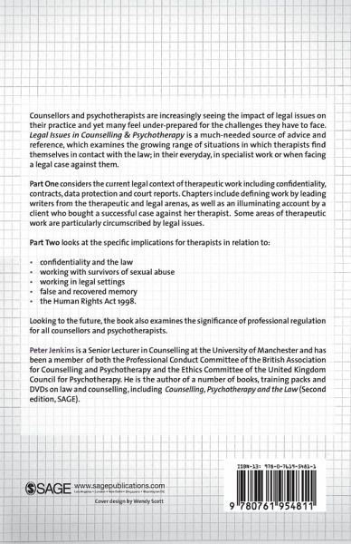 Peter Jenkins is a Lecturer in Counselling at the University of Manchester and a member of the Professional Conduct Committee of the British Association for Counselling and Psychotherapy. He is author of three books on the law and counselling, including Counselling, Psychotherapy and the Law (London, SAGE, 1997).Providing much-needed advice and reference, this book examines the rapidly growing range of situations in which therapists find themselves in contact with the law. The book covers the current legal context of therapeutic work, and specific implications for therapists in relation to: working with survivors of sexual abuse; false memory; and the implications of the Human Rights Act. The book also examines the implications of professional regulation.