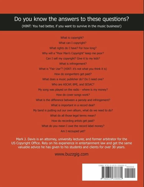 Do you know the answers to these questions? (You had better, if you want to survive in the music business.) * What can I copyright? * Why will a Poor Man copyright keep me poor? * Can I sell my copyright? Give it to my kids? * What is infringement? * What is Fair Use? (it is not what you think it is) * How do songwriters get paid? * What does a music publisher do? Do I need one? * Who are ASCAP, BMI, and SESAC? * How do cover songs work? * What is the difference between a parody and infringement? * What is in a record deal? * We are putting out our own album, what do we do? * What do all those legal terms mean? * How do recording artists get paid? * Am I recouped yet? Mark J. Davis is an attorney, university lecturer, and former arbitrator for the US Copyright Office. His students have gone on to careers in the music industry after taking his classes. Rely on his 30 years of experience in entertainment law.