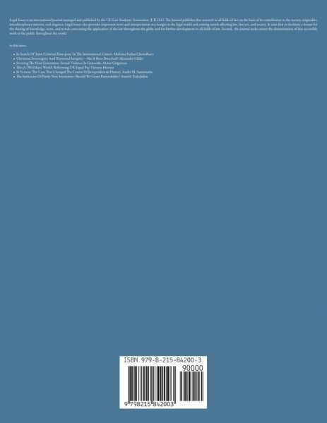 Legal Issues is an international journal managed and published by the UK Law Students' Association (UKLSA). The Journal publishes fine research in all fields of law on the basis of its contribution to the society, originality, interdisciplinary interest, and elegance. Legal Issues also provides important news and interpretation on changes in the legal world and coming trends affecting law, lawyers, and society. It aims first to facilitate a forum for the sharing of knowledge, news, and trends concerning the application of the law throughout the globe and for further development in all fields of law. Second, the journal seeks ensure the dissemination of fine accessible work to the public throughout the world. in this issue:In Search Of 'Joint Criminal Enterprise' In The International Crimes. Muhsina Farhat Chowdhury Ukrainian Sovereignty And Territorial Integrity – Has It Been Breached? Alexander Gilder Severing The Next Generation: Sexual Violence In Genocide. Arsiné Grigoryan This A (Wo)Man's World: Reforming UK Equal Pay. Victoria Hooten In Verrem: The Case That Changed The Course Of Jurisprudential History. André M. Santamaria The Intricacies Of Partly New Inventions: Should We Grant Patentability? Anatoli Tsakalidou