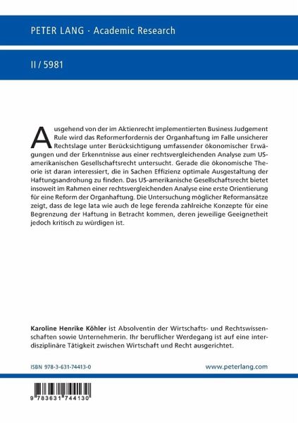 Ausgehend von der im Aktienrecht implementierten Business Judgement Rule wird das Reformerfordernis der Organhaftung im Falle unsicherer Rechtslage unter Berücksichtigung umfassender ökonomischer Erwägungen und der Erkenntnisse aus einer rechtsvergleichenden Analyse zum US-amerikanischen Gesellschaftsrecht untersucht. Gerade die ökonomische Theorie ist daran interessiert, die in Sachen Effizienz optimale Ausgestaltung der Haftungsandrohung zu finden. Das US-amerikanische Gesellschaftsrecht bietet insoweit im Rahmen einer rechtsvergleichenden Analyse eine erste Orientierung für eine Reform der Organhaftung. Die Untersuchung möglicher Reformansätze zeigt, dass de lege lata wie auch de lege ferenda zahlreiche Konzepte für eine Begrenzung der Haftung in Betracht kommen, deren jeweilige Geeignetheit jedoch kritisch zu würdigen ist.