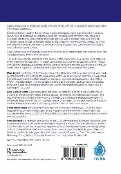 Legal Perspectives on Bridging Science and Policy deals with the interaction of science and policy from a legal perspective. Expert contributors outline the role of law in water management and suggest solutions to make laws flexible and adaptive to changes in scientific knowledge and environmental, social and economic conditions. Each chapter addresses the topic with a different focus and offers an in-depth analysis of legal challenges related to the creation of interdisciplinary bridges, clarifying how science may be assimilated into decision-making processes and can thereby contribute to build evidence-based policies. Legal Perspectives on Bridging Science and Policy will be of great interest to scholars of water law, water governance and environmental law. This book was originally published in the journal Water International, as a special issue prepared by the International Association for Water Law (known as AIDA from its Spanish acronym https://www.aida-waterlaw.org), gathering selected papers dealing with law and governance from the XVI World Water Congress of the International Water Resources Association (IWRA) (2017).