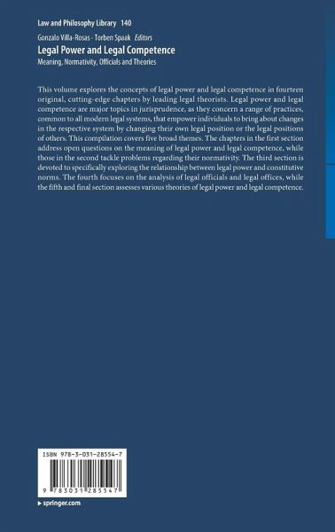 This volume explores the concepts of legal power and legal competence in fourteen original, cutting-edge chapters by leading legal theorists. Legal power and legal competence are major topics in jurisprudence, as they concern a range of practices, common to all modern legal systems, that empower individuals to bring about changes in the respective system by changing their own legal position or the legal positions of others. This compilation covers five broad themes. The chapters in the first section address open questions on the meaning of legal power and legal competence, while those in the second tackle problems regarding their normativity. The third section is devoted to specifically exploring the relationship between legal power and constitutive norms. The fourth focuses on the analysis of legal officials and legal offices, while the fifth and final section assesses various theories of legal power and legal competence.