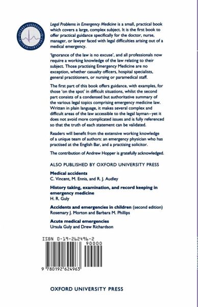 All professionals now require a working knowledge of the law relating to their subject. This text offers practical guidance specifically for the doctor, nurse, manager or lawyer faced with legal difficulties arising out of a medical emergency. The first part of the book offers guidance, with examples, for those "on the spot" in difficult situations, whilst the second part consists of a condensed but authoritative summary of the various legal topics comprising emergency medicine law. Written in plain language, it makes several complex and difficult areas of the law accessible to the legal layman, yet it does not avoid more complicated issues and is fully referenced so that the truth of each statement can be validated.