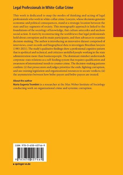 This work is dedicated to map the modes of thinking and acting of legal professionals who work in white-collar crime. Lawyers, whose decisions generate economic and political consequences, stand at a strategic location between the state and key segments of society. This monograph's approach is linked to the foundations of the sociology of knowledge, that culture antecedes and anchors social action. It starts by reconstructing the worldviews that legal professionals hold about corruption and its main participants, and then advances to examine decision-making. The author is introducing an innovative dataset comprised of interviews, court records and biographical data to investigate Brazilian lawyers (1985-2021). The study's qualitative findings show a professional cognitive pattern that is apolitical and technical, and criticizes unskilled people working in the state administration more than businesspeople. The dominant mindset understands corporate-state relations as a self-feeding system that requires qualification and awareness of international trends to counter crime. The decision-making patterns confirm: (i) that prosecutors and judges prioritize the ends, fighting corruption, and use existing legislation and organizational resources to secure verdicts; (ii) the asymmetries between how bribe-payers and bribe-payees are treated.