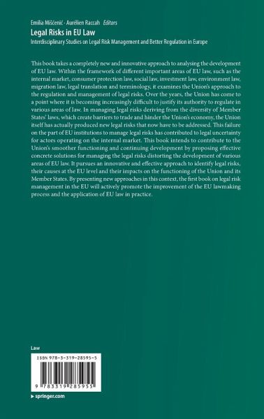 This book takes a completely new and innovative approach to analysing the development of EU law. Within the framework of different important areas of EU law, such as the internal market, consumer protection law, social law, investment law, environment law, migration law, legal translation and terminology, it examines the Union's approach to the regulation and management of legal risks. Over the years, the Union has come to a point where it is becoming increasingly difficult to justify its authority to regulate in various areas of law. In managing legal risks deriving from the diversity of Member States' laws, which create barriers to trade and hinder the Union's economy, the Union itself has actually produced new legal risks that now have to be addressed. This failure on the part of EU institutions to manage legal risks has contributed to legal uncertainty for actors operating on the internal market. This book intends to contribute to the Union's smoother functioning and continuingdevelopment by proposing effective concrete solutions for managing the legal risks distorting the development of various areas of EU law. It pursues an innovative and effective approach to identify legal risks, their causes at the EU level and their impacts on the functioning of the Union and its Member States. By presenting new approaches in this context, the first book on legal risk management in the EU will actively promote the improvement of the EU lawmaking process and the application of EU law in practice.