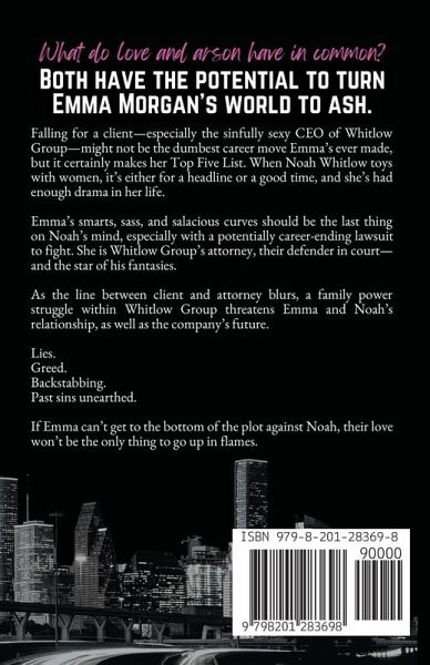 What do love and arson have in common? Both have the potential to turn Emma Morgan's world to ash. Falling for a client-especially the sinfully sexy CEO of Whitlow Group-might not be the dumbest career move Emma's ever made, but it certainly makes her Top Five List. When Noah Whitlow toys with women, it's either for a headline or a good time, and she's had enough drama in her life. Emma's smarts, sass, and salacious curves should be the last thing on Noah's mind, especially with a potentially career-ending lawsuit to fight. She is Whitlow Group's attorney, their defender in court-and the star of his fantasies. As the line between client and attorney blurs, a family power struggle within Whitlow Group threatens Emma and Noah's relationship, as well as the company's future. Lies. Greed. Backstabbing. Past sins unearthed. If Emma can't get to the bottom of the plot against Noah, their love won't be the only thing to go up in flames.