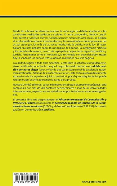 Desde los albores del derecho positivo, la ratio legis ha debido adaptarse a las cambiantes realidades políticas y sociales. En este compendio, titulado Legalidad, derecho y política. Marcos jurídicos para un nuevo contrato social, se delinea el sutil equilibrio entre el iusnaturalismo y las necesidades contemporáneas del actual statu quo, las más de las veces imbricando la política con la ley. El lector hallará en estos debates sobre los principios de libertad, la inteligencia artificial y los derechos humanos, un eco de la perpetua pugna entre seguridad jurídica y justicia. Fenómenos como el metaverso, la tecnología o el auge del lobby, trazan hoy la senda de los nuevos retos jurídicos analizados en estas páginas. La calidad exigible a toda obra científica, y este libro la satisface cumplidamente, viene certificada por el hecho de que lo aquí plasmado deriva de una doble revisión por pares ciegos (peer review) lo que garantiza su nivel de excelencia académica irrefutable. Además de esta fórmula a priori, este texto queda públicamente expuesto ante los expertos al juicio a posteriori, por el que cualquier lector puede refutar lo aquí escrito aportando la carga de la prueba. Nuestro Comité Editorial, cuyos miembros encabezan las presentes páginas, está compuesto por más de 200 doctores pertenecientes a más de 40 Universidades internacionales, expertos en los variados campos tratados en estas investigaciones. El presente libro está auspiciado por el Fórum Internacional de Comunicación y Relaciones Públicas (Fórum XXI), la Sociedad Española de Estudios de la Comunicación Iberoamericana (SEECI) y el Grupo Complutense (nº 931.791) de Investigación en Comunicación Concilium.