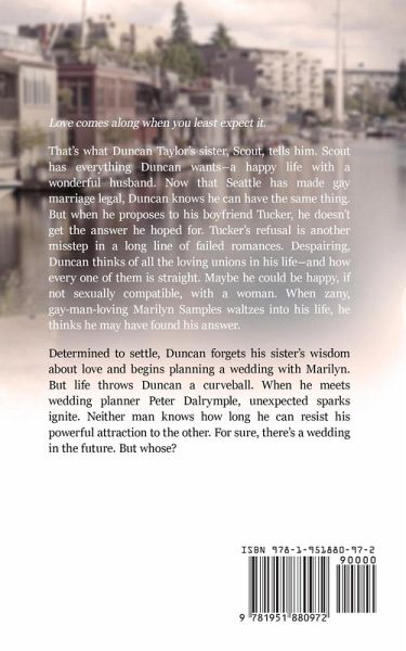 Love comes along when you least expect it.That's what Duncan Taylor's sister, Scout, tells him. Scout has everything Duncan wants¿a happy life with a wonderful husband. Now that Seattle has made gay marriage legal, Duncan knows he can have the same thing. But when he proposes to his boyfriend Tucker, he doesn't get the answer he hoped for. Tucker's refusal is another misstep in a long line of failed romances. Despairing, Duncan thinks of all the loving unions in his life¿and how every one of them is straight. Maybe he could be happy, if not sexually compatible, with a woman. When zany, gay-man-loving Marilyn Samples waltzes into his life, he thinks he may have found his answer.Determined to settle, Duncan forgets his sister's wisdom about love and begins planning a wedding with Marilyn. But life throws Duncan a curveball. When he meets wedding planner Peter Dalrymple, unexpected sparks ignite. Neither man knows how long he can resist his powerful attraction to the other. For sure, there's a wedding in the future. But whose?