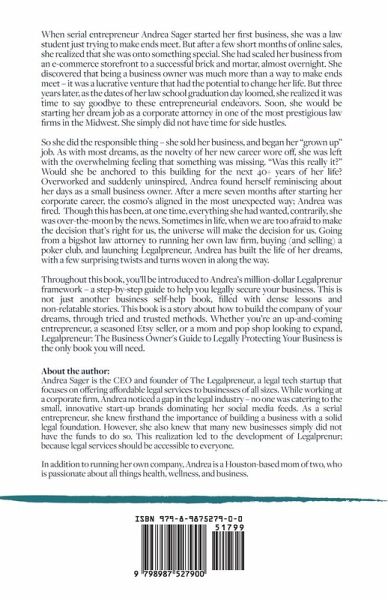 When serial entrepreneur Andrea Sager started her first business, she was a law student just trying to make ends meet. But after a few short months of online sales, she realized that she was onto something special. She had scaled her business from an e-commerce storefront to a successful brick and mortar, almost overnight. She discovered that being a business owner was much more than a way to make ends meet - it was a lucrative venture that had the potential to change her life. But three years later, as the dates of her law school graduation day loomed, she realized it was time to say goodbye to these entrepreneurial endeavors. Soon, she would be starting her dream job as a corporate attorney in one of the most prestigious law firms in the Midwest. She simply did not have time for side hustles. So she did the responsible thing - she sold her business, and began her "grown up" job. As with most dreams, as the novelty of her new career wore off, she was left with the overwhelming feeling that something was missing. "Was this really it?" Would she be anchored to this building for the next 40+ years of her life? Overworked and suddenly uninspired, Andrea found herself reminiscing about her days as a small business owner. After a mere seven months after starting her corporate career, the cosmo's aligned in the most unexpected way; Andrea was fired. Though this has been, at one time, everything she had wanted, contrarily, she was over-the-moon by the news. Sometimes in life, when we are too afraid to make the decision that's right for us, the universe will make the decision for us. Going from a bigshot law attorney to running her own law firm, buying (and selling) a poker club, and launching Legalpreneur, Andrea has built the life of her dreams, with a few surprising twists and turns woven in along the way. Throughout this book, you'll be introduced to Andrea's million-dollar Legalprenur framework - a step-by-step guide to help you legally secure your business. This is not just another business self-help book, filled with dense lessons and non-relatable stories. This book is a story about how to build the company of your dreams, through tried and trusted methods. Whether you're an up-and-coming entrepreneur, a seasoned Etsy seller, or a mom and pop shop looking to expand, Legalpreneur: The Business Owner's Guide to Legally Protecting Your Business is the only book you will need.