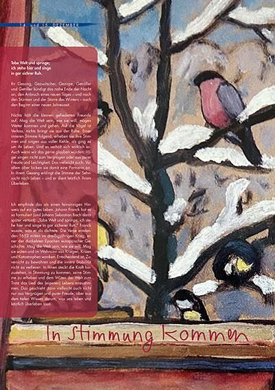 Der Künstlerinnen-Adventskalender lädt ein, auf dem Weg durch den Advent die Bilderwelt von Gabriele Münter zu entdecken. Diese Bilderwelt eröffnet inihrer expressionistischen Palette neue adventliche Erfahrungen: Erwartungsvoll und aufmerksam zu bleiben, neugierig, nachdenklich, beseelt, horchend und wahrnehmend das Ohr stets an sein Herz zu legen.