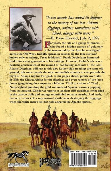 For years, the tale of a group of miners who found a hidden canyon of gold only to be massacred by the Apache was legend across the Old West. Initially spread in saloons by the lone survivor known only as Adams, Texas folklorist J. Frank Dobie later immortalized it for a new generation in his writings. However, Dobie's tale was a pastiche constructed of the myriad of conflicting accounts of the Lost Adams Diggings, still lost to this day. Rather than treading the same old ground, this tome corrals the most outlandish minutia to ever pervade the myth of Adams and his lost gold. In the pages ahead, puzzle over tales of Billy the Kid searching for the diggings and even rumors of the Jesse James gang using the canyon as a hideout. Thrill to visions of Chief Nana's ghost guarding the gold and undead Apache warriors popping from the ground. Wonder at reports of ancient cliff dwellings embedded in the canyon walls and strange mummified remains nearby. And lastly, marvel at stories of a supernatural earthquake destroying the diggings when the white man's lust for gold angered the Apache spirits...