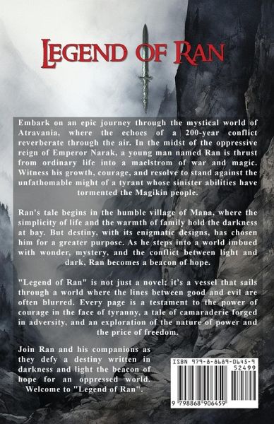 Embark on an epic journey through the mystical world of Atravania, where the echoes of a 200-year conflict reverberate through the air. In the midst of the oppressive reign of Emperor Narak, a young man named Ran is thrust from ordinary life into a maelstrom of war and magic. Witness his growth, courage, and resolve to stand against the unfathomable might of a tyrant whose sinister abilities have tormented the Magikin people. Ran's tale begins in the humble village of Mana, where the simplicity of life and the warmth of family hold the darkness at bay. But destiny, with its enigmatic designs, has chosen him for a greater purpose. As he steps into a world imbued with wonder, mystery, and the conflict between light and dark, Ran becomes a beacon of hope. "Legend of Ran" is not just a novel; it's a vessel that sails through a world where the lines between good and evil are often blurred. Every page is a testament to the power of courage in the face of tyranny, a tale of camaraderie forged in adversity, and an exploration of the nature of power and the price of freedom. Join Ran and his companions as they defy a destiny written in darkness and light the beacon of hope for an oppressed world. Welcome to "Legend of Ran".