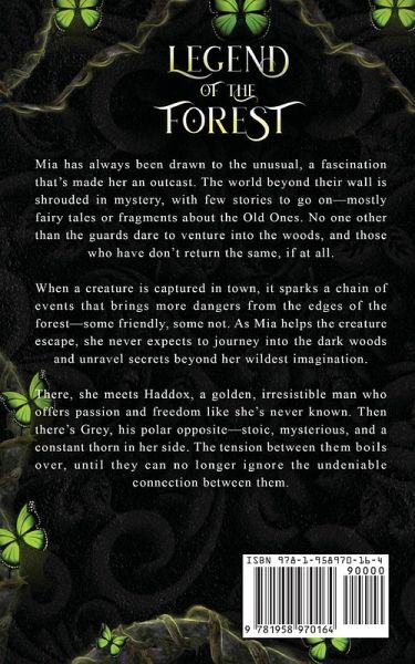 Mia has always been drawn to the unusual, a fascination that's made her an outcast. The world beyond their wall is shrouded in mystery, with few stories to go on-mostly fairy tales or fragments about the Old Ones. No one other than the guards dare to venture into the woods, and those who have don't return the same, if at all. When a creature is captured in town, it sparks a chain of events that brings more dangers from the edges of the forest-some friendly, some not. As Mia helps the creature escape, she never expects to journey into the dark woods and unravel secrets beyond her wildest imagination. There, she meets Haddox, a golden, irresistible man who offers passion and freedom like she's never known. Then there's Grey, his polar opposite-stoic, mysterious, and a constant thorn in her side. The tension between them boils over, until they can no longer ignore the undeniable connection between them.
