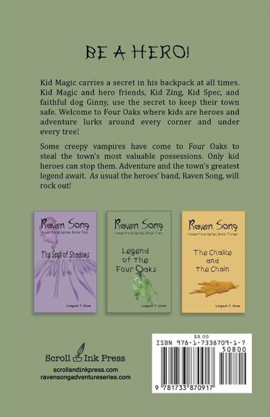 Kids spring to action in The Raven Song Adventure Series, a new collection of chapter books for young readers from Scroll & Ink Press. Welcome to Four Oaks where three young heroes, one amazing dog, and a secret scroll only kids can read, protect the town from all manner of magical and scary creatures. In the second title of the series, Legend of the Four Oaks, by Lougash T. Shaw, some creepy vampires have come to Four Oaks to steal the town's most valuable possessions. Only kid heroes can stop them. Adventure and the town's greatest legend await. As usual the heroes' band, Raven Song, will rock out! The story allows young readers to locate themselves in settings where intelligence and creativity flourish. The book begins with a call to action to imagine, and ends with a call to action to create.