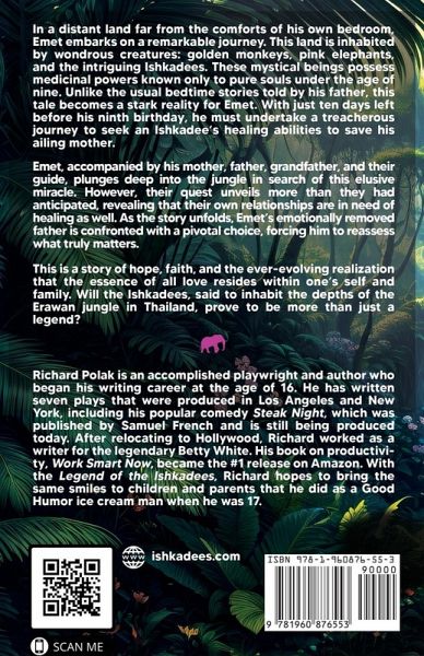 In a distant land far from the comforts of his own bedroom, Emet embarks on a remarkable journey. This land is inhabited by wondrous creatures: golden monkeys, pink elephants, and the intriguing Ishkadees. These mystical beings possess medicinal powers known only to pure souls under the age of nine. Unlike the usual bedtime stories told by his father, this tale becomes a stark reality for Emet. With just ten days left before his ninth birthday, he must undertake a treacherous journey to seek an Ishkadee's healing abilities to save his ailing mother. Emet, accompanied by his mother, father, grandfather, and their guide, plunges deep into the jungle in search of this elusive miracle. However, their quest unveils more than they had anticipated, revealing that their own relationships are in need of healing as well. As the story unfolds, Emet's emotionally removed father is confronted with a pivotal choice, forcing him to reassess what truly matters. This is a story of hope, faith, and the ever-evolving realization that the essence of all love resides within one's self and family. Will the Ishkadees, said to inhabit the depths of the Erawan jungle in Thailand, prove to be more than just a legend?
