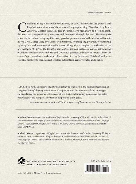 Conceived in 1976 and published in 1980, LEGEND exemplifies the political and linguistic commitments of then-nascent Language writing. Coauthored by Bruce Andrews, Charles Bernstein, Ray DiPalma, Steve McCaffery, and Ron Silliman, the work was composed on typewriters and developed through the mail. The twenty-six poems of the volume bring together every possible permutation of collaborative authorship in one-, two-, three-, and five-author combinations, revealing the evolution of distinctive styles against and in conversation with others. Along with a complete reproduction of the original text, LEGEND: The Complete Facsimile in Context includes a critical introduction by editors Matthew Hofer and Michael Golston, a generous selection of material from the authors' correspondence, and a new collaborative piece by the authors. This book will be an essential resource to students and scholars in twentieth-century poetry and poetics.