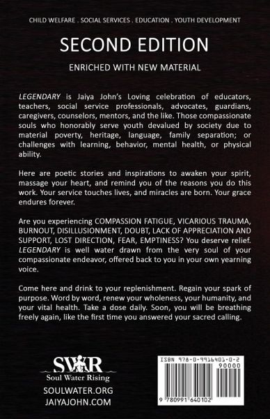 Legendary is Jaiya John's Loving celebration of educators, teachers, social service professionals, advocates, guardians, caregivers, counselors, mentors, and the like. Those compassionate souls who honorably serve youth devalued by society due to material poverty, heritage, language, family separation; or challenges with learning, behavior, mental health, or physical ability. Here are poetic stories and inspirations to awaken your spirit, massage your heart, and remind you of the reasons you do this work. Your service touches lives, and miracles are born. Your grace endures forever. Are you experiencing compassion fatigue, vicarious trauma, burnout, disillusionment, doubt, lack of appreciation and support, lost direction, fear, emptiness? You deserve relief. Legendary is well water drawn from the very soul of your compassionate endeavor, offered back to you in your own yearning voice. Come here and drink to your replenishment. Regain your spark of purpose. Word by word, renew your wholeness, your humanity, and your vital health. Take a dose daily. Soon, you will be breathing freely again, like the first time you answered your sacred calling.