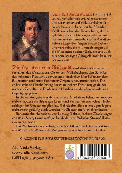Die Legenden von Rübezahl sind altes böhmisches Volksgut, das Musäus aus Chroniken, Volksbüchern, den Schriften des Johannes Praetorius sowie aus mündlicher Überlieferung alter Bäuerinnen und eines Weimarer Originals zusammenstellte. Die volkstümliche Überlieferung hat er in lockere Erzählung gekleidet und den Gestalten in Denken und Handeln ein durchaus modernes Gepräge gegeben. In dieser Ausgabe wurden veraltete Ausdrücke behutsam modernisiert, sodass ein flüsssiges Lesen und Verstehen auch ohne Nachschlagen im Glossar möglich ist. Gebräuche, die der heutigen Jugend nicht mehr geläufig sind, werden im Glossar ausführlich erläutert. Romantische Holzstiche von Ludwig Richter, lockere Zeichnungen von Max Slevogt und kräftige Farbbilder von Wilhelm Stumpf illustrieren die Texte.Das Nachwort von Ludwig Storch schildert die Lebensumstände von Musäus in Weimar als Zeitgenosse von Goethe und Herder.