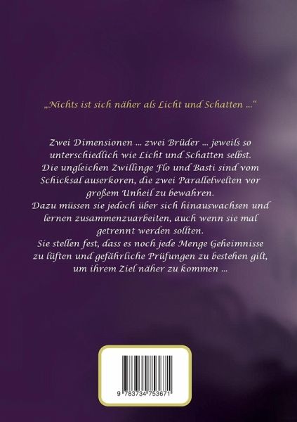 "Nichts ist sich näher als Licht und Schatten ..."Zwei Dimensionen ... zwei Brüder ... jeweils so unterschiedlich wie Licht und Schatten selbst.Die ungleichen Zwillinge Flo und Basti sind vom Schicksal auserkoren, die zwei Parallelwelten vor großem Unheil zu bewahren.Dazu müssen sie jedoch über sich hinauswachsen und lernen zusammenzuarbeiten, auch wenn sie mal getrennt werden sollten.Sie stellen fest, dass es noch jede Menge Geheimnisse zu lüften und gefährliche Prüfungen zu bestehen gilt, um ihrem Ziel näher zu kommen ...