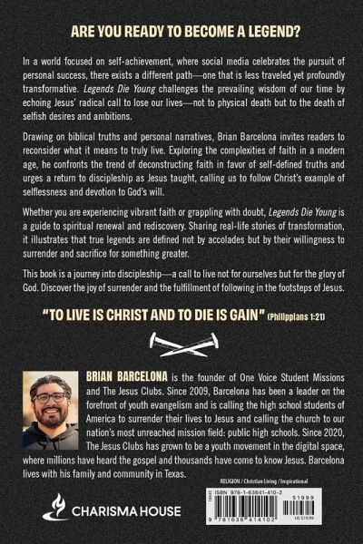 "Every martyr had surrendered long before their ultimate sacrifice, death. This book will help me to grow in faith and strengthen my understanding of all that God is. I will watch as God patches up the wounds of my heart so that I can step fully into the calling and all the plans that He has for my life. Legends Die Young unveils the journey every believer embarks on-a battle against forces seeking to separate them from their faith in Jesus. In an era marked by deconstruction and great offense, where the timeless solution lies in the essence of discipleship, this book isn't just a collection of narratives; it's a repository of practical wisdom and contemporary tales featuring modern legends in the Christian faith who selflessly sacrificed themselves to ensure the longevity of their faith. It echoes a truth: every martyr had surrendered long before their ultimate sacrifice, death. Many books teach you to be a better you; few teach you to lay your life down. Within these pages readers will explore transcending bitterness, betrayal, and unforgiveness, as well as navigating through the storms of hardship with grace and mercy as our guiding lights. Whether readers are shepherding a small group or leading stadiums, this book underscores the essence of nurturing their heart's core and fostering an unwavering connection with God-a connection resilient against the cunning schemes of the devil, ensuring a life marked by resounding victory. This book aspires to penetrate the very essence of a believer's soul, igniting in them an unshakable and triumphant faith in Jesus. It's crafted to profoundly impact readers, equipping them with tangible tools to overcome challenges, accompanied by real-life narratives of individuals who have traversed similar paths. "Potential prodigals will never have to eat with pigs if their faith in Jesus is strengthened and they simply can see light at the end of the tunnel of whatever season they are in." -Brian Barcelona"--