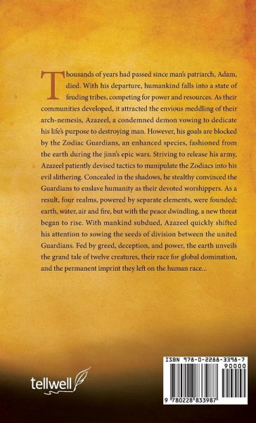 Thousands of years had passed since man's patriarch, Adam, died. With his departure, humankind falls into a state of feuding tribes, competing for power and resources. As their communities developed, it attracted the envious meddling of their arch-nemesis, Azazeel, a condemned demon vowing to dedicate his life's purpose to destroying man. However, his goals are blocked by the Zodiac Guardians, an enhanced species, fashioned from the earth during the jinn's epic wars. Striving to release his army, Azazeel patiently devised tactics to manipulate the Zodiacs into his evil slithering. Concealed in the shadows, he stealthy convinced the Guardians to enslave humanity as their devoted worshippers. As a result, four realms, powered by separate elements, were founded; earth, water, air and fire, but with the peace dwindling, a new threat began to rise. With mankind subdued, Azazeel quickly shifted his attention to sowing the seeds of division between the united Guardians. Fed by greed, deception, and power, the earth unveils the grand tale of twelve creatures, their race for global domination, and the permanent imprint they left on the human race...