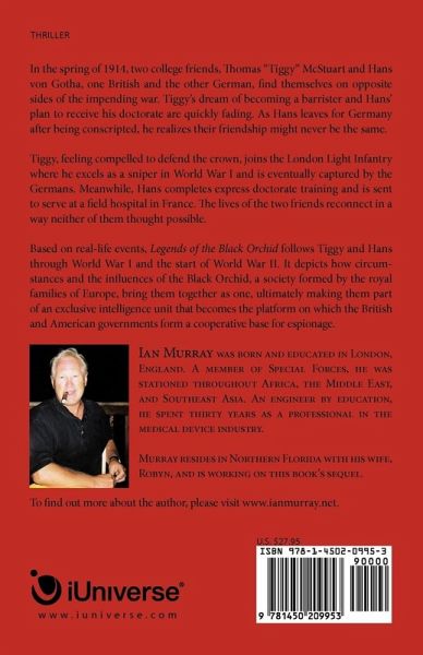 In the spring of 1914, two college friends, Thomas "Tiggy" McStuart and Hans von Gotha, one British and the other German, find themselves on opposite sides of the impending war. Tiggy's dream of becoming a barrister and Hans' plan to receive his doctorate are quickly fading. As Hans leaves for Germany after being conscripted, he realizes their friendship might never be the same. Tiggy, feeling compelled to defend the crown, joins the London Light Infantry where he excels as a sniper in World War I and is eventually captured by the Germans. Meanwhile, Hans completes express doctorate training and is sent to serve at a field hospital in France. The lives of the two friends reconnect in a way neither of them thought possible. Based on real-life events, Legends of the Black Orchid follows Tiggy and Hans through World War I and the start of World War II. It depicts how circumstances and the influences of the Black Orchid, a society formed by the royal families of Europe, bring them together as one, ultimately making them part of an exclusive intelligence unit that becomes the platform on which the British and American governments form a cooperative base for espionage.