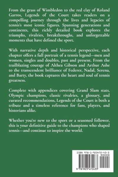 From the grass of Wimbledon to the red clay of Roland Garros, Legends of the Court takes readers on a compelling journey through the lives and legacies of tennis's most iconic figures. Spanning generations and continents, this richly detailed book explores the triumphs, rivalries, breakthroughs, and unforgettable moments that have defined the sport. With narrative depth and historical perspective, each chapter offers a full portrait of a tennis legend-men and women, singles and doubles, past and present. From the trailblazing courage of Althea Gibson and Arthur Ashe to the transcendent brilliance of Federer, Nadal, Serena, and Barty, the book captures the heart and soul of tennis greatness. Complete with appendices covering Grand Slam stats, Olympic champions, classic rivalries, a glossary, and curated recommendations, Legends of the Court is both a tribute and a timeless reference for fans, players, and historians alike. Whether you're new to the sport or a seasoned follower, this is your definitive guide to the champions who shaped tennis-and continue to inspire the world.