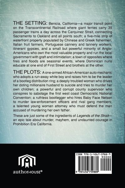 The setting: Prohibition Era Benicia, California-a major terminal on the Transcontinental Railroad where giant ferries carry 35 passenger trains a day across the Carquinez Strait, connecting Sacramento to Oakland and all points south; a five-mile strip of waterfront property populated by Chinese and Greek fishermen, Italian fruit farmers, Portuguese cannery and tannery workers, itinerant gypsies, and a small minority of Anglo-Americans who own the most valuable property and run the local government with graft and intimidation; a town of opposites where fires and floods are seasonal events, where Dominican nuns educate at one end of First Street and brothels at the other. The characters and plot: A one-armed African-American auto mechanic who adopts a run-away white boy and raises him to be the leader of a bootleg distribution ring; a deeply troubled woman who drives her doting millionaire husband to suicide and tries to murder her own children; a powerful and corrupt county supervisor who conspires to sabotage the first west coast Democratic National Convention; a ruthless bootlegger who hires Baby Face Nelson to murder law-enforcement officers and rival gang members; a talented young woman attorney who must defend the man accused of murdering her own father. The historical background: It was during Prohibition that George Santayana wrote: "Those who cannot learn from history are doomed to repeat it." These words resonate in our own time as America's political leaders continue to push their agendas for "change." The Prohibition Era (1919-1933) was also a time of change when new technologies like the electric light, the telephone, and the combustion engine transformed society worldwide; when broadcast radio and motion pictures began homogenizing America's cultural values; when the Scopes "monkey trail" challenged the basic precepts of religious tradition; and when Margaret Sanger's crusade for birth control and eugenics forecast some of the most compelling political issues of the 21st Century. The central plot of Legends of the Strait involves two childhood friends growing up in a small California town. This novel is more than a coming-of-age story, though. It's about the growing pains of a nation suddenly thrust onto the world stage as a great power and about the "quiet desperation" of individuals struggling with a host of new cultural and economic changes as well as with the age-old conflict between good and evil. Like all legends, Legends of the Strait is a moral tale.