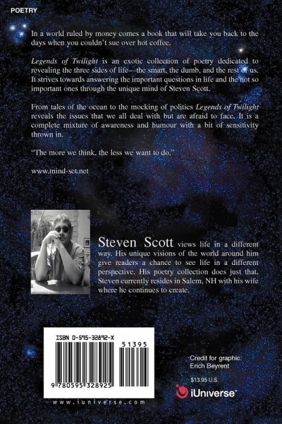 In a world ruled by money comes a book that will take you back to the days when you couldn't sue over hot coffee. Legends of Twilight is an exotic collection of poetry dedicated to revealing the three sides of life--the smart, the dumb, and the rest of us. It strives towards answering the important questions in life and the not so important ones through the unique mind of Steven Scott. From tales of the ocean to the mocking of politics Legends of Twilight reveals the issues that we all deal with but are afraid to face. It is a complete mixture of awareness and humour with a bit of sensitivity thrown in. "The more we think, the less we want to do." www.mind-set.net