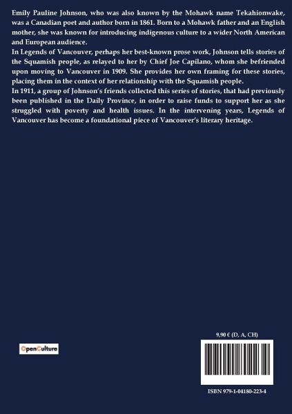 Emily Pauline Johnson, who was also known by the Mohawk name Tekahionwake, was a Canadian poet and author born in 1861. Born to a Mohawk father and an English mother, she was known for introducing indigenous culture to a wider North American and European audience. In Legends of Vancouver, perhaps her best-known prose work, Johnson tells stories of the Squamish people, as relayed to her by Chief Joe Capilano, whom she befriended upon moving to Vancouver in 1909. She provides her own framing for these stories, placing them in the context of her relationship with the Squamish people. In 1911, a group of Johnson¿s friends collected this series of stories, that had previously been published in the Daily Province, in order to raise funds to support her as she struggled with poverty and health issues. In the intervening years, Legends of Vancouver has become a foundational piece of Vancouver¿s literary heritage.