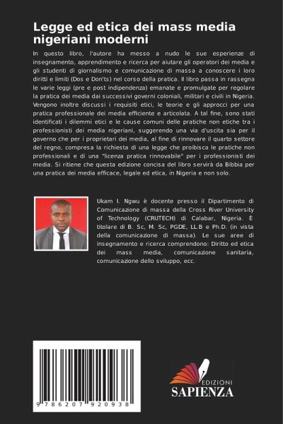 In questo libro, l'autore ha messo a nudo le sue esperienze di insegnamento, apprendimento e ricerca per aiutare gli operatori dei media e gli studenti di giornalismo e comunicazione di massa a conoscere i loro diritti e limiti (Dos e Don'ts) nel corso della pratica. Il libro passa in rassegna le varie leggi (pre e post indipendenza) emanate e promulgate per regolare la pratica dei media dai successivi governi coloniali, militari e civili in Nigeria. Vengono inoltre discussi i requisiti etici, le teorie e gli approcci per una pratica professionale dei media efficiente e articolata. A tal fine, sono stati identificati i dilemmi etici e le cause comuni delle pratiche non etiche tra i professionisti dei media nigeriani, suggerendo una via d'uscita sia per il governo che per i proprietari dei media, al fine di rinnovare il quarto settore del regno, compresa la richiesta di una legge che proibisca le pratiche non professionali e di una "licenza pratica rinnovabile" per i professionisti dei media. Si ritiene che questa edizione concisa del libro servirà da Bibbia per una pratica dei media efficace, legale ed etica, in Nigeria e non solo.