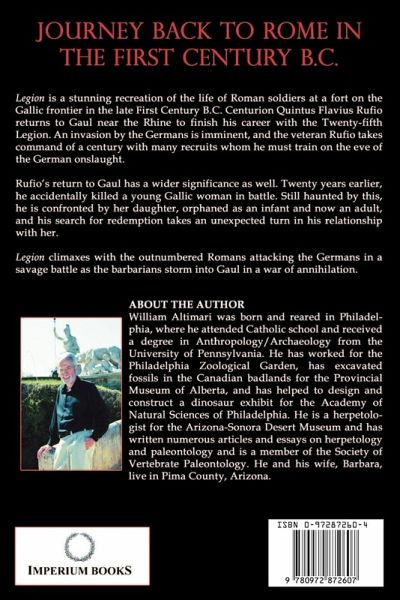 Legion is a stunning recreation of the life of Roman soldiers at a fort on the Gallic frontier in the late First Century B.C. Centurion Quintus Flavius Rufio returns to Gaul near the Rhine to finish his career with the Twenty-fifth Legion. An invasion by the Germans is imminent, and the veteran Rufio takes command of a century with many recruits whom he must train on the eve of the German onslaught. Rufio's return to Gaul has a wider significance as well. Twenty years earlier, he accidentally killed a young Gallic woman in battle. Still haunted by this, he is confronted by her daughter, orphaned as an infant and now an adult, and his search for redemption takes an unexpected turn in his relationship with her. Legion climaxes with the outnumbered Romans attacking the Germans in a savage battle as the barbarians storm into Gaul in a war of annihilation.
