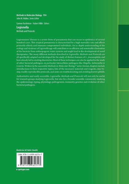 Authoritative and easily accessible, Legionella: Methods and Protocols will not only be useful for research groups studying Legionella, but also for a broader scientific community studying the epidemiology, typing, physiology, pathogenesis, immunity, genetics and evolution of other bacterial pathogens.