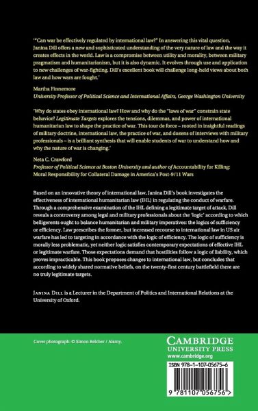 Based on an innovative theory of international law, Janina Dill's book investigates the effectiveness of international humanitarian law (IHL) in regulating the conduct of warfare. Through a comprehensive examination of the IHL defining a legitimate target of attack, Dill reveals a controversy among legal and military professionals about the 'logic' according to which belligerents ought to balance humanitarian and military imperatives: the logics of sufficiency or efficiency. Law prescribes the former, but increased recourse to international law in US air warfare has led to targeting in accordance with the logic of efficiency. The logic of sufficiency is morally less problematic, yet neither logic satisfies contemporary expectations of effective IHL or legitimate warfare. Those expectations demand that hostilities follow a logic of liability, which proves impracticable. This book proposes changes to international law, but concludes that according to widely shared normative beliefs, on the twenty-first-century battlefield there are no truly legitimate targets.