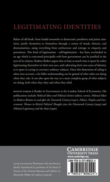 Rulers of all kinds, from feudal monarchs to democratic presidents and prime ministers, justify themselves to themselves through a variety of rituals, rhetoric, and dramatisations, using everything from architecture and coinage to etiquette and portraiture. This kind of legitimation - self-legitimation - has been overlooked in an age which is concerned principally with how government can be justified in the eyes of its citizens. In this book, Rodney Barker argues that at least as much time is spent by rulers legitimating themselves in their own eyes, and cultivating their own sense of identity, as is spent in trying to convince ordinary subjects. Once this dimension of ruling is taken into account, a far fuller understanding can be gained of what rulers are doing when they rule. It can also open the way to a more complete grasp of what subjects are doing, both when they obey and when they rebel.