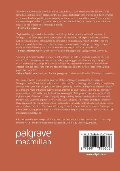 E. L. Desmond, brings to light the views of farmers on Bt cotton, the only genetically modified crop currently cultivated in India, in the context of legitimation of risk. ... the author has produced a thoughtprovoking work that navigates this controversial topic with a new lens, by digging deep into politics and society in village India." (Anitha Ramanna-Pathak, American Journalof Sociology, Vol. 124, May, 2019)