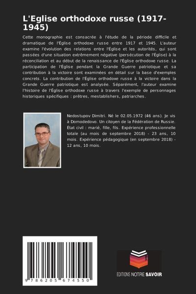 Cette monographie est consacrée à l'étude de la période difficile et dramatique de l'Église orthodoxe russe entre 1917 et 1945. L'auteur examine l'évolution des relations entre l'Église et les autorités, qui sont passées d'une situation extrêmement négative (persécution de l'Église) à la réconciliation et au début de la renaissance de l'Église orthodoxe russe. La participation de l'Église pendant la Grande Guerre patriotique et sa contribution à la victoire sont examinées en détail sur la base d'exemples concrets. La contribution de l'Église orthodoxe russe à la victoire dans la Grande Guerre patriotique est analysée. Séparément, l'auteur examine l'histoire de l'Église orthodoxe russe à travers l'exemple de personnages historiques spécifiques : prêtres, mestablishers, patriarches.