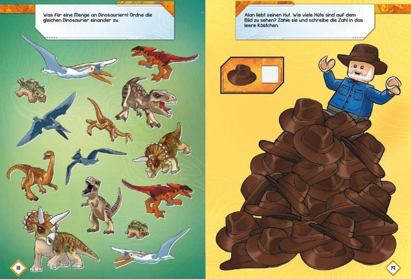 Dinosaurierstarke Rätsel- mit LEGO® Minifigur "Alan Grant"Owen Grady, Claire Dearing und der Paläontologe Dr. Alan Grant brauchen die Hilfe ihrer treuen Fans! Denn im Dinosaurierfreizeitpark Jurassic World(TM) herrscht wieder einmal Chaos. Gemeinsam müssen sie knifflige Rätselmissionen meistern und die Ordnung im Park wiederherstellen. On spannende Ausgrabungen, wilde Verfolgungsjagden mit Dinosauriern oder unerwartete Entdeckungen - nur als Team können die Fans und ihre Helden die Aufgaben meistern. Für zusätzlichen Spielspaß sorgt dabei die coole LEGO® Minifigur "Alan Grant", mit der die Fans im Anschluss an die Rätsel die Missionen nachspielen können. Inspiration für das Spiel bieten hier auch die detailreichen handgezeichneten Illustrationen. Nicht nur die aufregenden Rätsel werden junge Fans ab 6 Jahren begeistern, sondern auch der lustige Comic und die witzigen Infos über Alan Grant. Jurassic World Dominion © 2022 Universal City Studios LLC and Amblin Entertainment, Inc. All Rights Reserved. LEGO, the LEGO logo, the Brick and Knob configurations and the Minifigure are trademarks of the LEGO Group. ©2022 The LEGO Group.