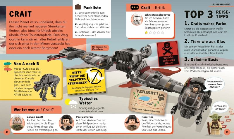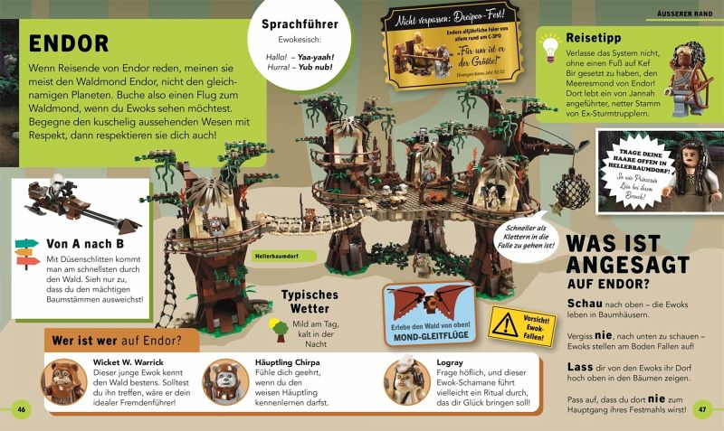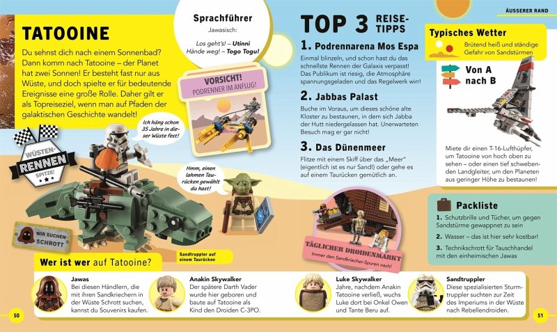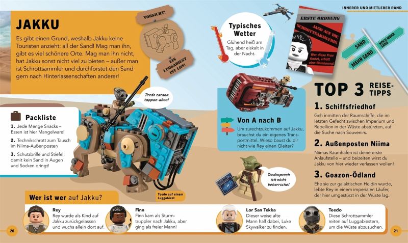 Vom Wüstenplaneten Tatooine über die Eiswelt Hoth bis hin zu seinem Sumpfversteck auf Dagobah der legendäre Jedi-Meister Yoda präsentiert die 25 faszinierendsten Welten der Star Wars Galaxis. Dabei erfahren Fans alles über die Gefahren und Geheimnisse der Planeten. Damit sie optimal für die galaktischen Abenteuer gerüstet sind, ist die exklusive Yoda Minifigur mit Stab, Rucksack, Kamera und Karte ausgestattet.